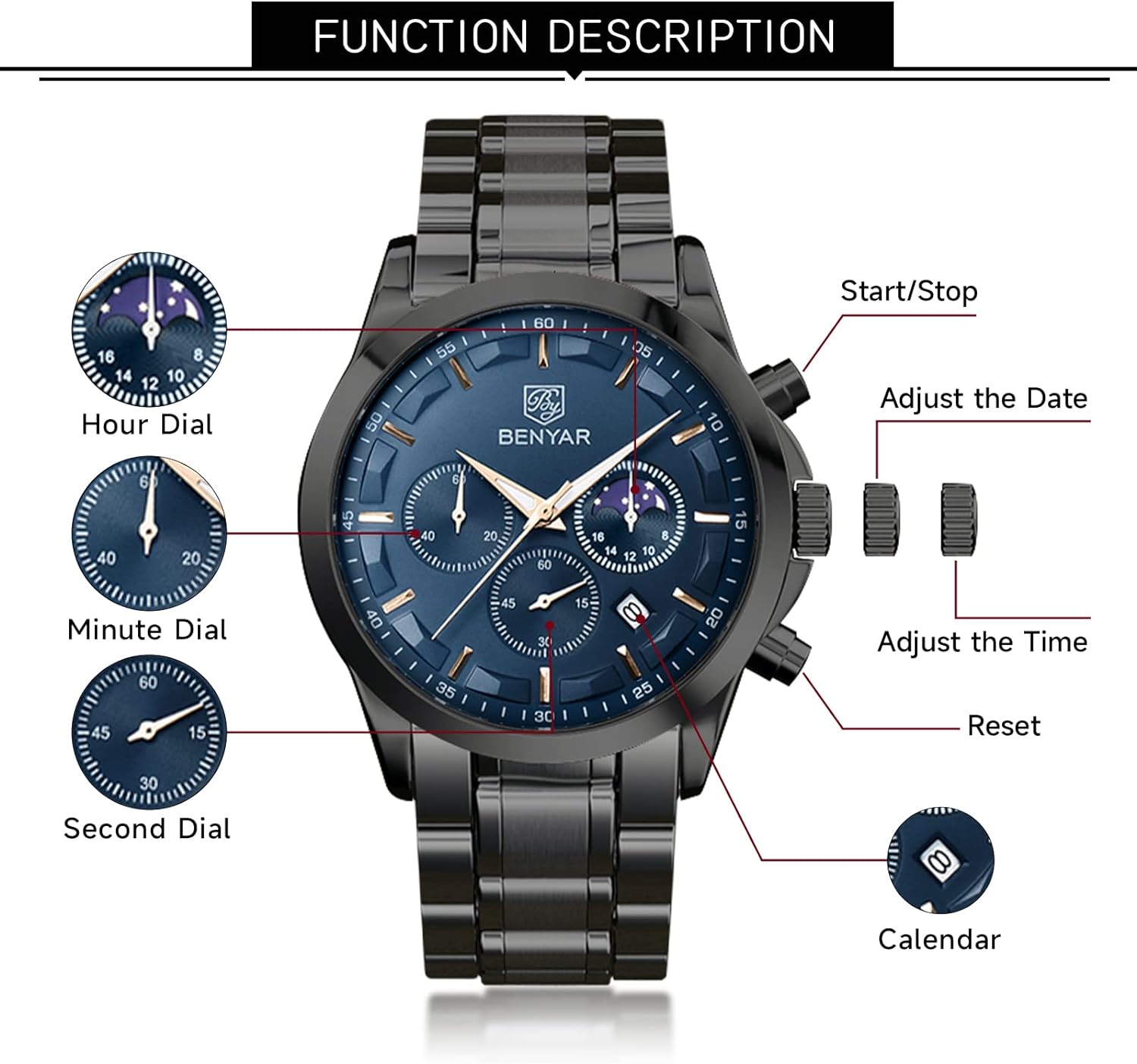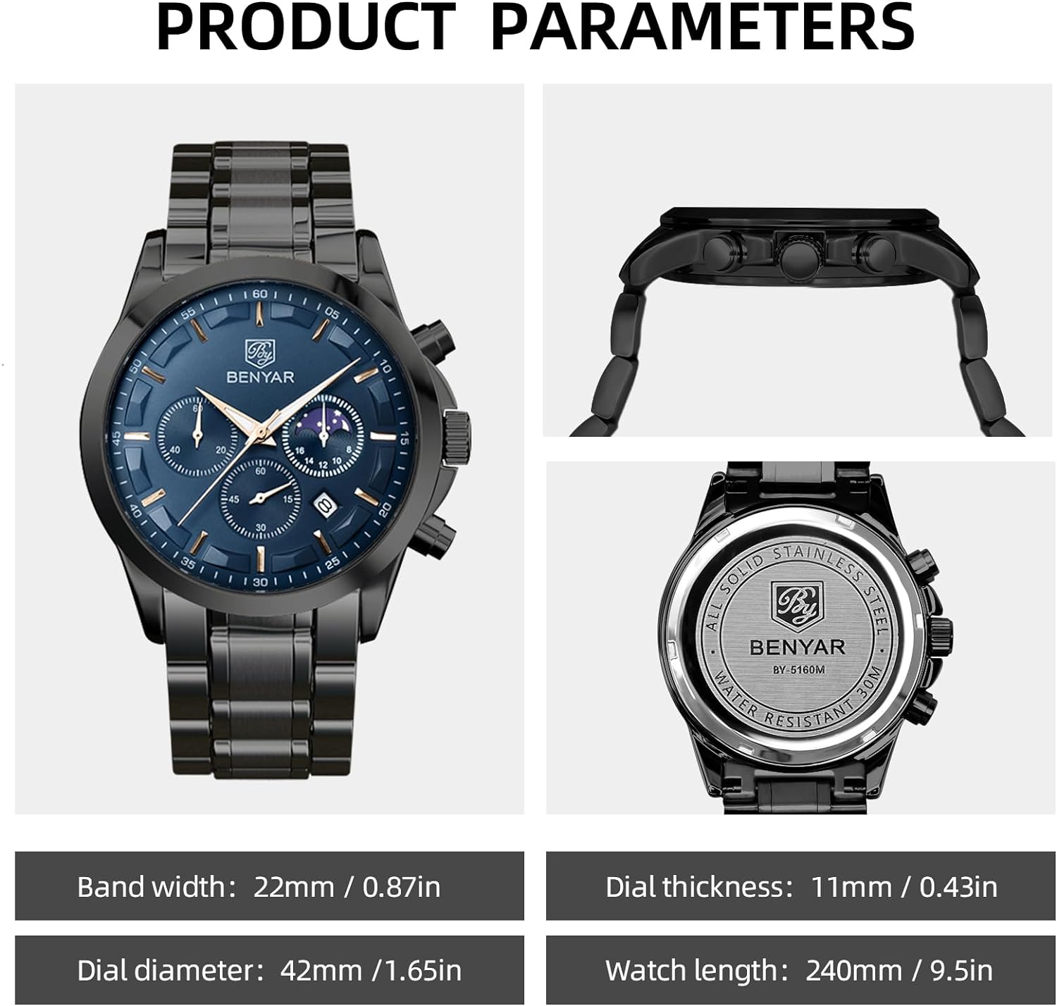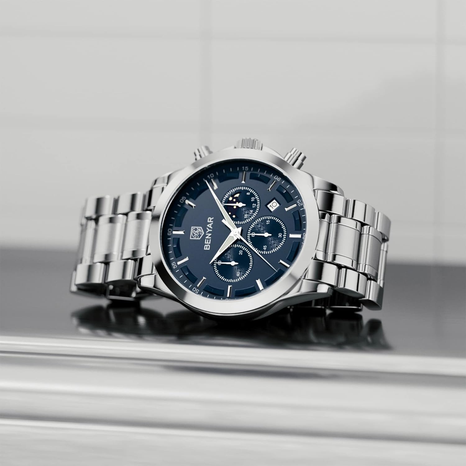 - 👔【COMFORT&DURABLE】When you need a watch prove that you value your time. BENYAR Stainless steel strap watch, not only makes a comfortable sense for your wrist but also easy to match your clothes. Our Analog wrist watches are perfect for the adventurer or the everyday man who is looking for a stylish match his outfit. Our passion drives us towards perfection, putting in hours and hours of work to get a truly amazing and unique end product.