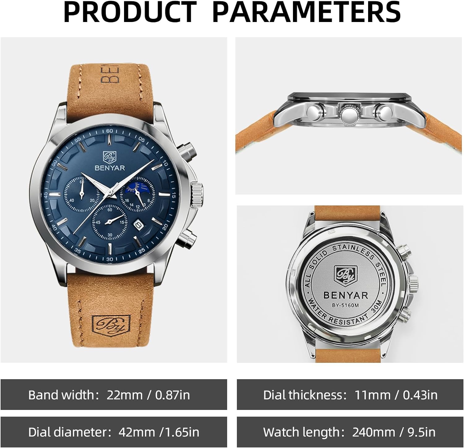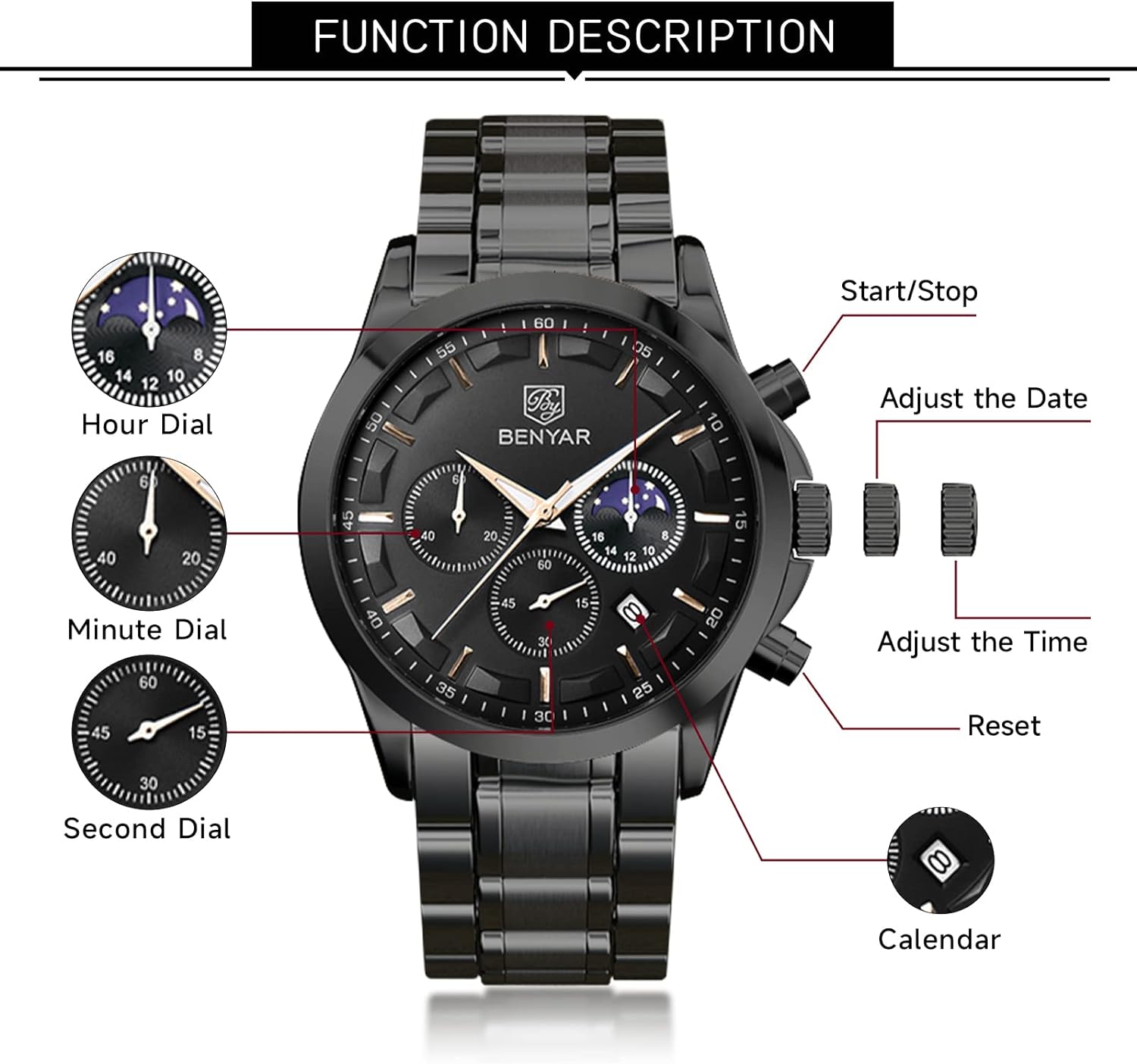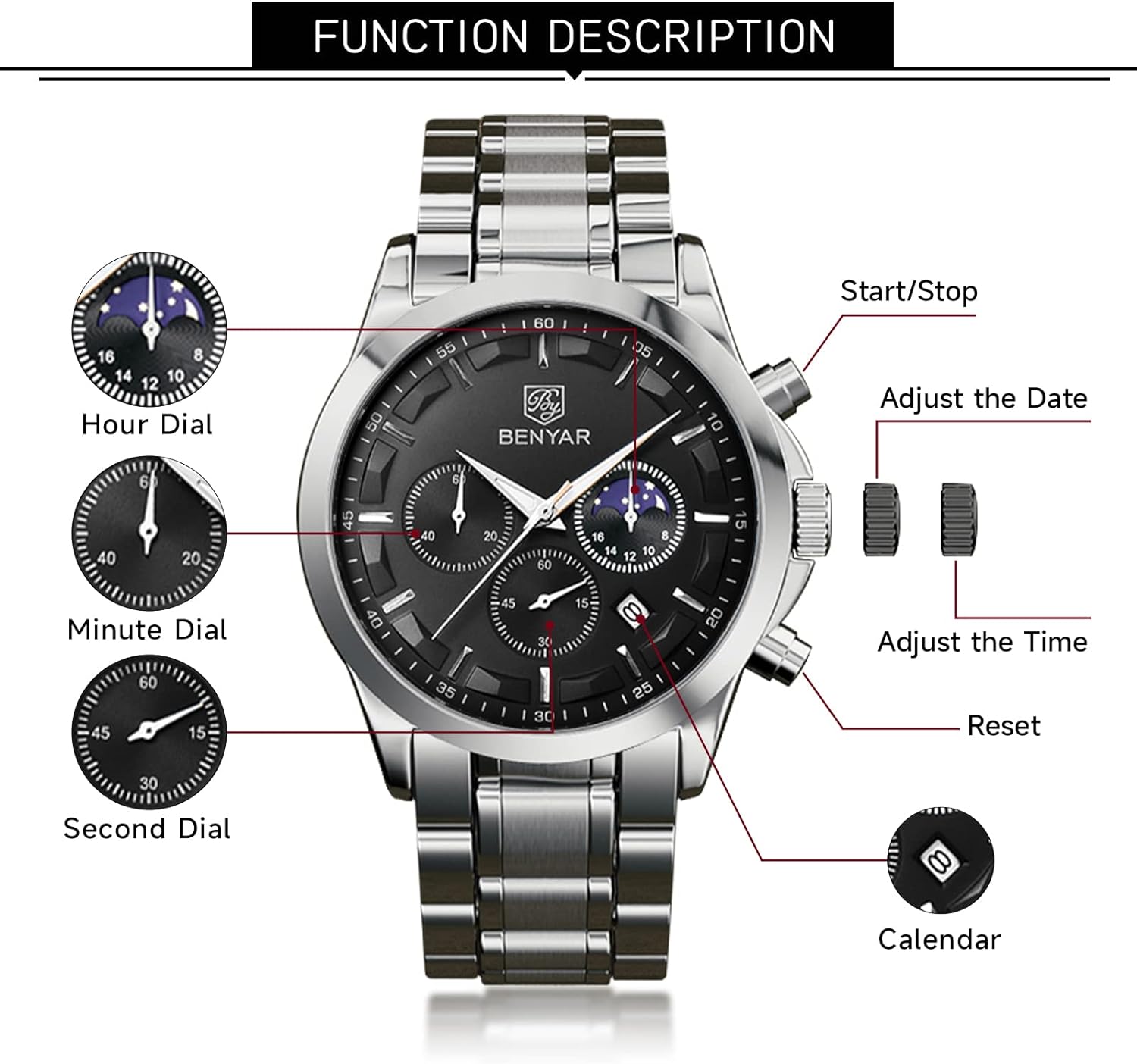 - 👔【COMFORT&DURABLE】When you need a watch prove that you value your time. BENYAR Stainless steel strap watch, not only makes a comfortable sense for your wrist but also easy to match your clothes. Our Analog wrist watches are perfect for the adventurer or the everyday man who is looking for a stylish match his outfit. Our passion drives us towards perfection, putting in hours and hours of work to get a truly amazing and unique end product.