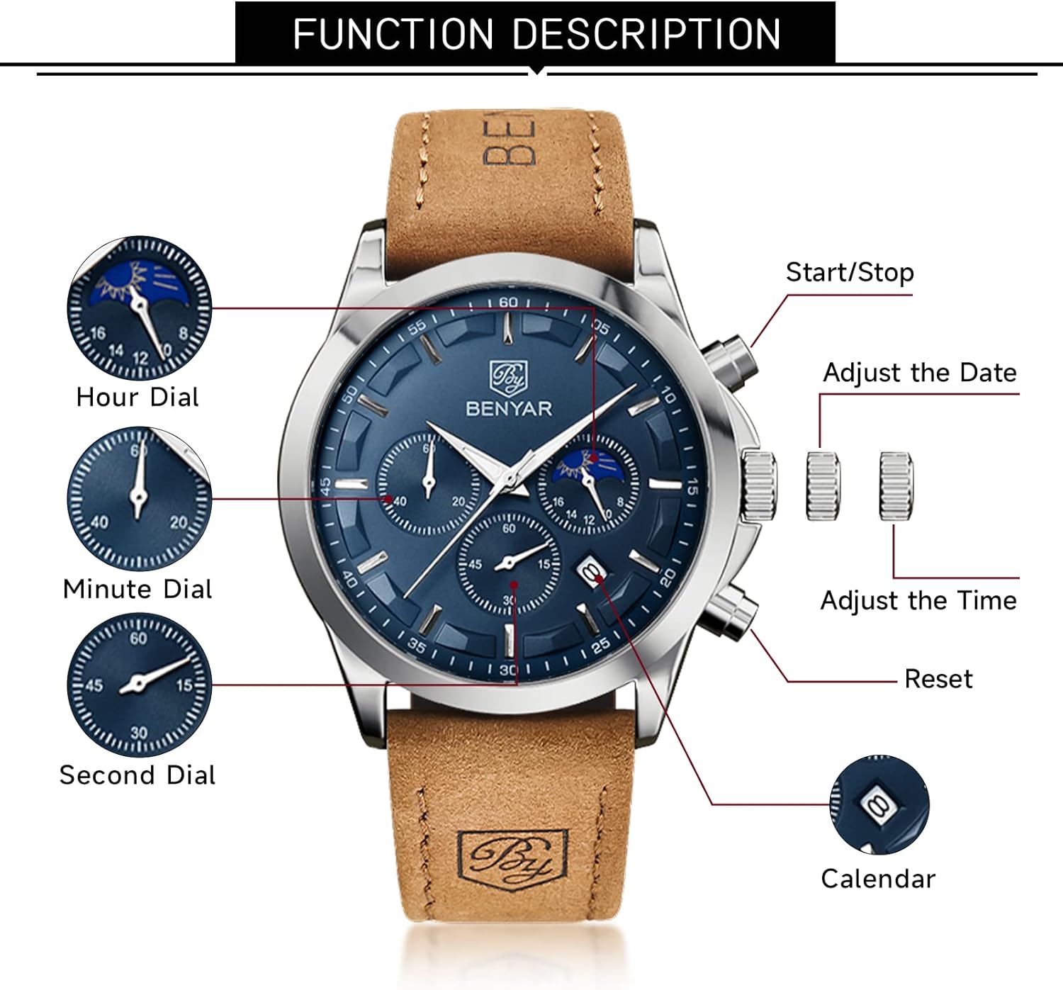BY BENYAR Men's Watches Waterproof Sport Military Watch for Men Multifunction Chronograph Black Fashion Quartz Wristwatches Calendar with Leather Strap/Stainless Steel